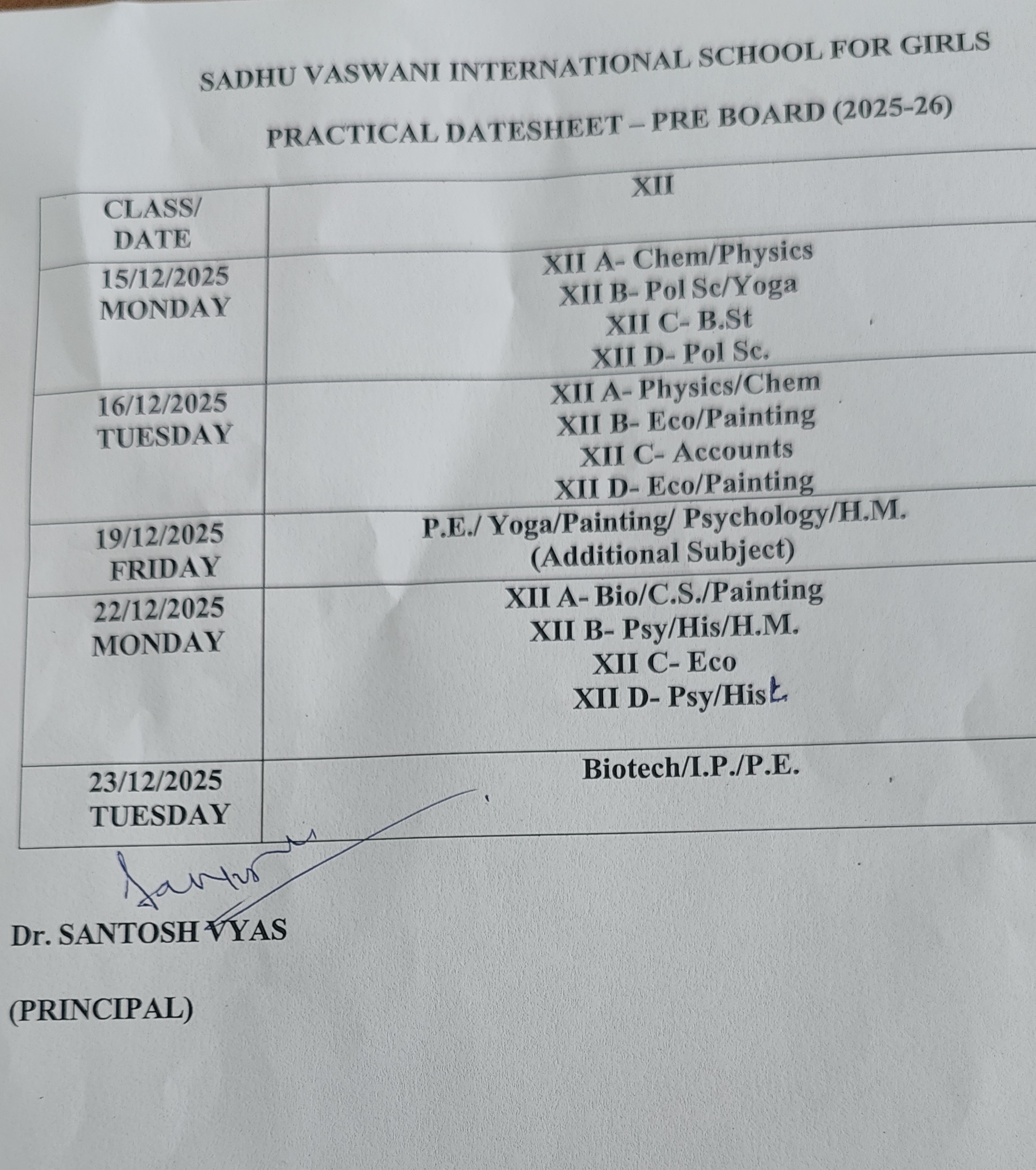 Date Sheet for Pre-Board Practical Examination Class XII (2025-26)
