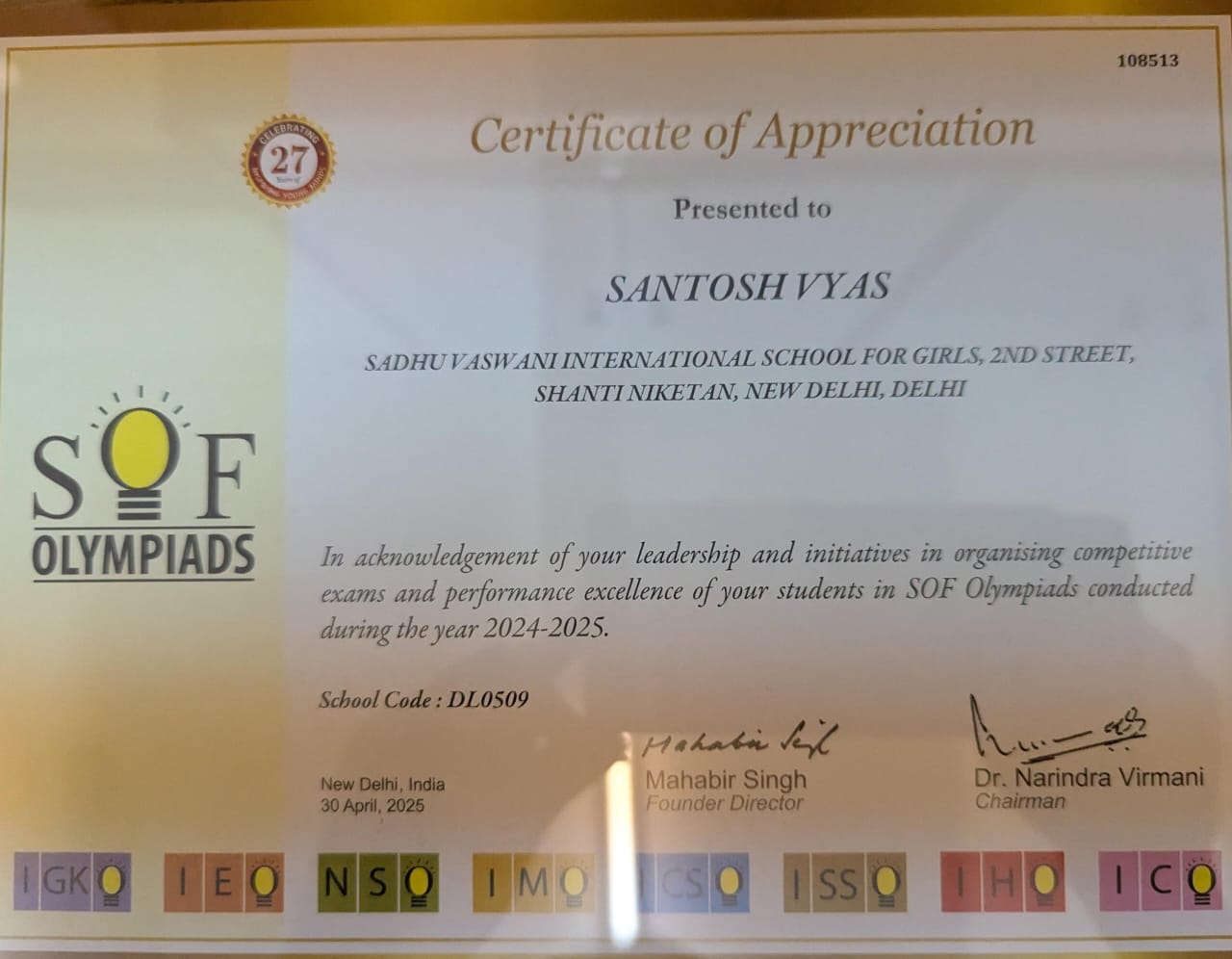 LETTER OF APPRECIATION SCIENCE OLYMPIAD FOUNDATION